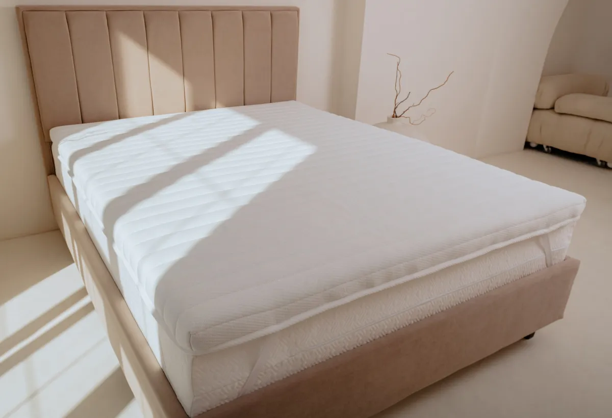 Топпер «Клевер»: ровная и жёсткая основаГлавная задача этой модели — создать плотную и ровную поверхность. Если ваш старый матрас пружинит или на нём чувствуются ямы, этот топпер это исправит. В основе — два слоя. Снизу 6 см ортопедической пены для упругой поддержки. Сверху — 1 см плиты из био-кокоса. Это смесь натуральных волокон, она очень плотная и не проминается. За счёт этого топпер получается жёстким, выше средней жёсткости. Чехол из мягкого трикотажа скрывает эту жёсткую начинку. Он приятный на ощупь, и за ним легко ухаживать.