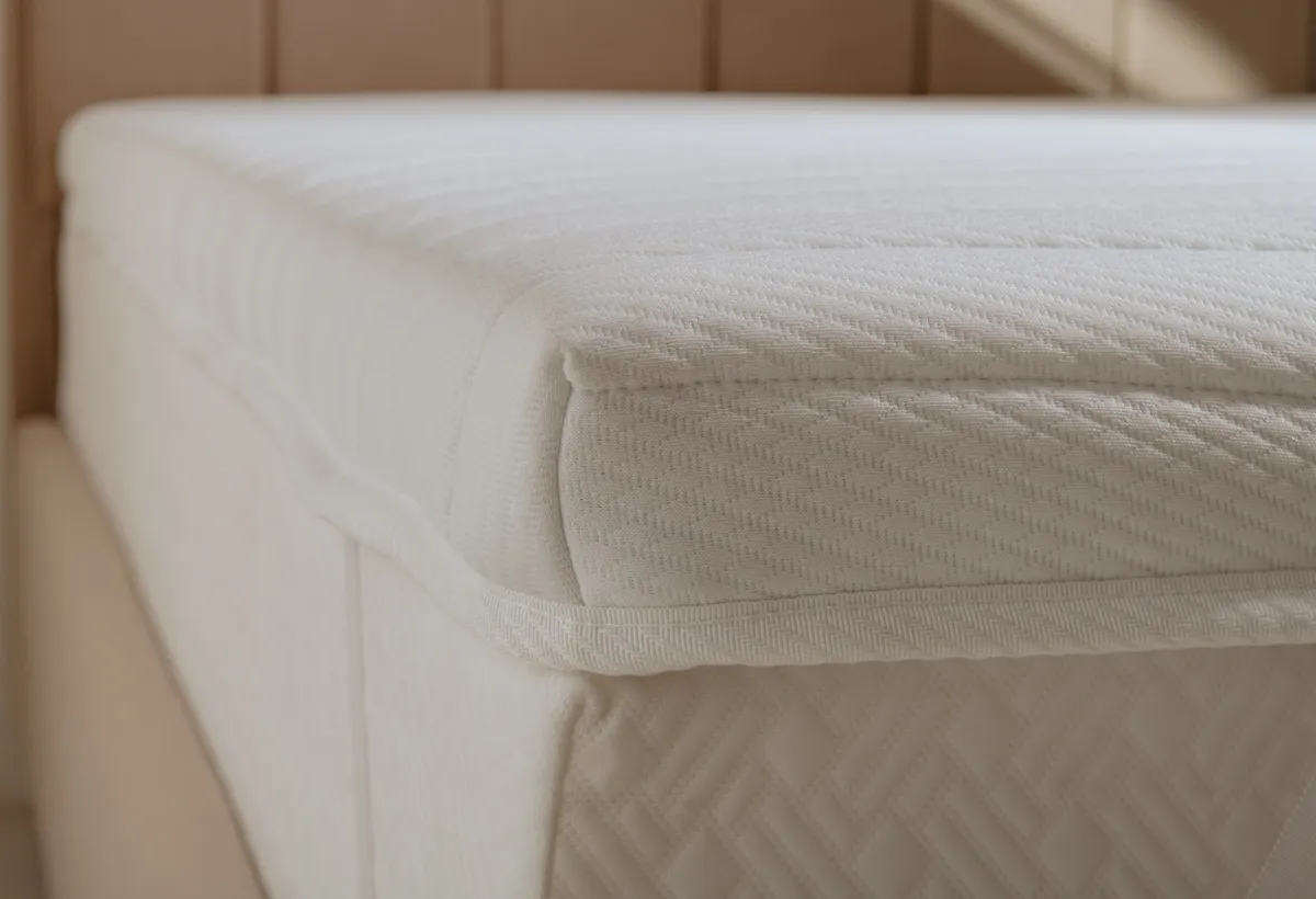 Топпер «Мелисса»: упругость и релаксЭтот топпер создан, чтобы помочь вам по-настоящему расслабиться. Он не жёсткий, а упругий и отзывчивый — тело на нём не проваливается, а мягко поддерживается. Всё дело в двух слоях пены. Нижний, 2 см, — это плотная основа для поддержки. Верхний, 3 см, — пена с рельефной поверхностью. Она создаёт лёгкий массажный эффект, который помогает снять напряжение после долгого дня. Это не интенсивный массаж, а скорее приятное покалывание для расслабления. Вместе они создают комфортную среднюю жёсткость. А стёганый чехол сверху делает поверхность приятной на ощупь.